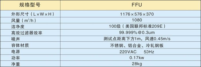 ??FFU有初、高效两级过滤网。风机从FFU顶部将空气吸入并经初高效过滤器过滤,过滤后的洁净空气在整个出风面以0.45m/s±20%的风速均速送出。